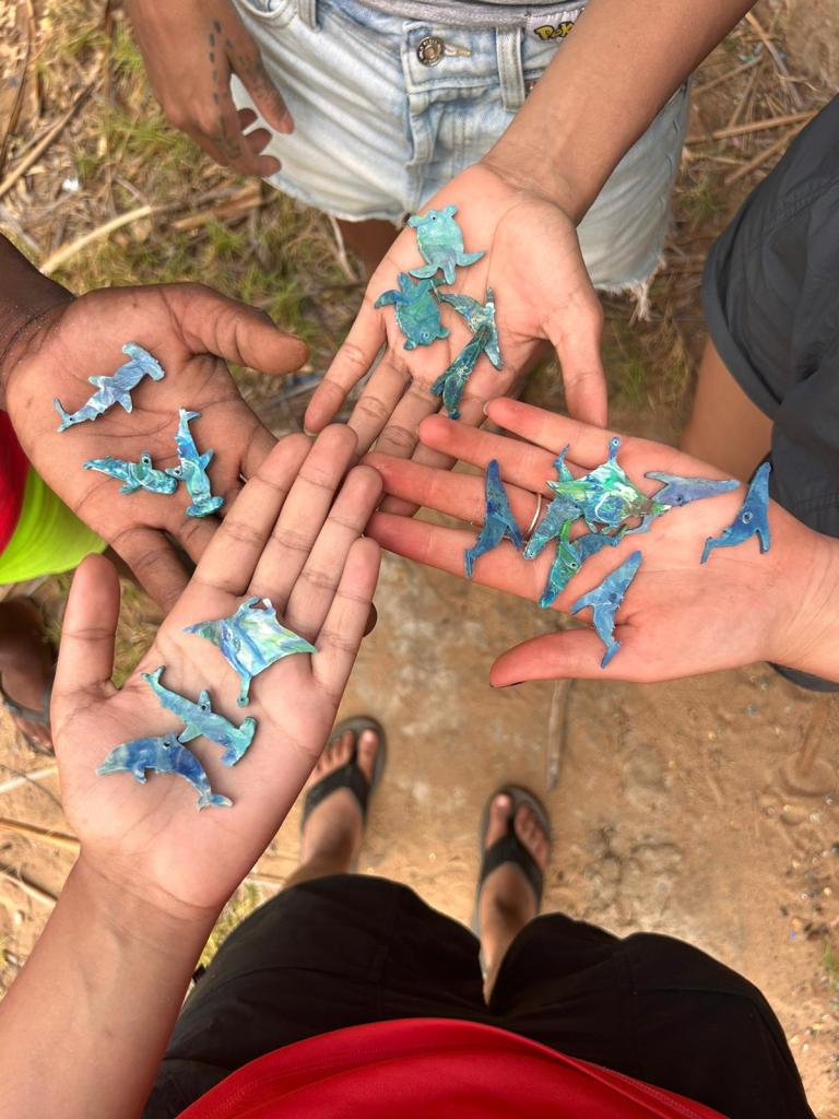 Ocean trash was a tale of two teams… With Barcelona totally owning it and Chelsea coming up short with anything that could go wrong going wrong… Gathering the rubbish from the beach was relatively easy, with a total of three bags easily gathered in an hour on both sides… Rather depressingly really when we all know how long it takes to decompose, even the best of us still use single use plastics from time to time… (mental note, must do better)… The sorting, data logging also easy and fairly simple to get done. Now when it comes to transforming rubbish, LTO have acquired this amazing little Sea Monkey Machine which takes your average thrown away plastic bottle cap, shreds it into little pieces, melts it down which you can then squeeze into moulds of different shapes which you can then make anything with: earrings, necklaces, keyrings…. Very cool piece of equipment. As I said, Barcelona smashed it and they are all now walking around with various cool earrings hanging from their ears. No such luck for Chelsea, as we struggled to bolt the mould tight, struggled even more to unbolt the mould after squeezing in the plastic and after finding a vice in which we could place the mould, we struggled then to untighten and tighten the vice… So after 20 minutes, managing to complete one hammerhead, one manta and one humpback mould, we decided enough was enough and we would get one with making the holes and tidying them up, making them into lovely trinkets… But alas, again, the heavens decided otherwise and we were doomed with a power cut, on again? no off again, on? no, no, just a teaser then off for the out. At least we know what the end result should look like, and we’re determined to enable our little marine creatures to shine very soon! Also providing solace from our bad luck with the plastic machine was the fact that morning we had seen a beautiful sunrise followed by a large pod of dolphins playing in the bay. Then to top it off upon sending the drone up to record the dolphins Mario managed to stumble across a whale shark, not a bad Friday morning!