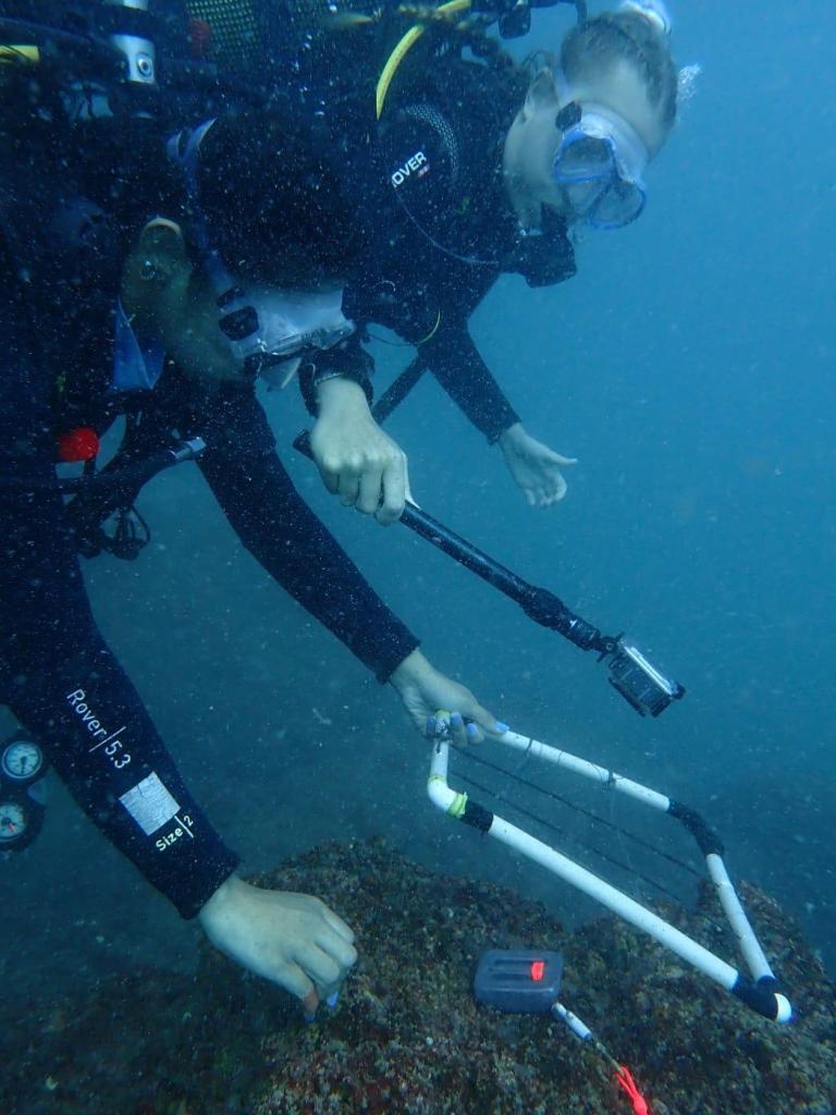 Finally, we did a reef transect to collect data while diving. We look like real Christmas trees with all the necessary equipment – quadrat, tape, extra weights, go pro. We’ve got it all? Ready ? One, two, three, go ! Backroll entry in the water, and let’s do it! The location of the start of the transect is chosen, the direction taken. One of us unrolls the tape, following the direction. Well… trying to follow the direction… Because the surge is so powerful that divers and tape are flying in all directions over the reef – it’s like a ribbon sportive rythmic gymnastics choreography! But we made it. Data collection continues with the current, video after video – video of pelagic fish, video of fish, sea stars, sea urchins living on the rock, video of sponges, corals, ascidians. Once the tape is wound up again, we’re off to hunt for nudibranchs – they’re everywhere! The dive was challenging but we did it! We’re back on the boat with a smile on our faces… and plenty of data to log in!